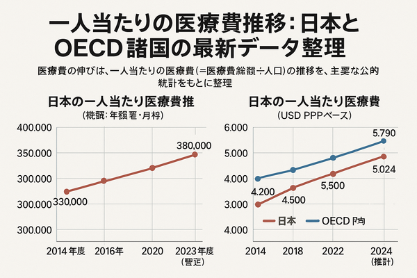 医療費の伸びは、少子高齢化や医療技術の高度化とともに、家計や社会保障制度に大きな影響を与えています。本稿では、公的統計(厚生労働省・OECD 等)をもとに、一人当たりの医療費(=医療費総額 ÷ 人口)の推移を、日本を中心に整理しました。日本の円建ての推移と、国際比較に用いられる購買力平価ベースのドル建てデータの両面から俯瞰できるように構成しています。